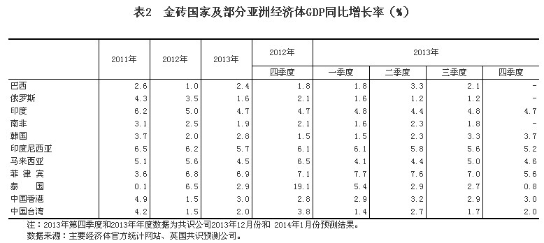 (一)世界經(jīng)濟(jì)增速回落。據(jù)國際貨幣基金組織2014年1月份估計(jì),按照購買力平價(jià)法GDP匯總,2013年全球經(jīng)濟(jì)增長3.0%,比上年放緩0.1個(gè)百分點(diǎn);據(jù)世界銀行2014年1月份估計(jì),按匯率法GDP匯總,2013年全球經(jīng)濟(jì)增長2.4%,比上年放緩0.1個(gè)百分點(diǎn)。2013年,美國經(jīng)濟(jì)增長1.9%,比上年放緩0.9個(gè)百分點(diǎn)。日本經(jīng)濟(jì)增長1.6%,比上年加快0.2個(gè)百分點(diǎn)。英國共識(shí)公司2014年1月份預(yù)計(jì),2013年歐元區(qū)經(jīng)濟(jì)下降0.4%,降幅比上年擴(kuò)大0.2個(gè)百分點(diǎn);俄羅斯、印度和南非經(jīng)濟(jì)增長1.6%、4.7%和1.9%,增速分別比上年放緩1.9、0.3和0.6個(gè)百分點(diǎn);巴西經(jīng)濟(jì)增長2.4%,比上年加快1.4個(gè)百分點(diǎn)。