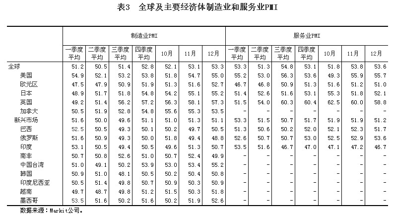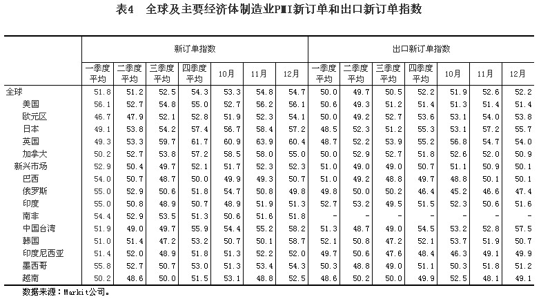 (八)景氣指標(biāo)總體向好。據(jù)OECD統(tǒng)計(jì),12月份,以長期趨勢為100,OECD國家整體先行指數(shù)達(dá)100.9,連續(xù)12個(gè)月上升,其中,美國、歐元區(qū)和日本分別達(dá)101.0、101.1和101.4,均呈上升趨勢,表明今后半年左右時(shí)間內(nèi)發(fā)達(dá)國家經(jīng)濟(jì)前景看好。第四季度,全球及主要經(jīng)濟(jì)體制造業(yè)PMI及其中的新訂單指數(shù)和出口新訂單指數(shù)均有所回升,新興市場制造業(yè)這三個(gè)指標(biāo)均重回景氣區(qū)間;全球服務(wù)業(yè)PMI受美國服務(wù)業(yè)PMI大幅下降的拖累比第三季度有所回落,但仍處于景氣區(qū)間且顯著高于上半年。12月份,全球制造業(yè)PMI升至53.3的近32個(gè)月最高水平,已連續(xù)第13個(gè)月高于50的臨界點(diǎn)。其中,新訂單指數(shù)為54.7,僅比11月份的近33個(gè)月新高略低0.1個(gè)點(diǎn)。