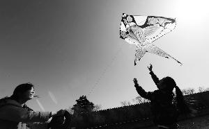 昨日,在故宮角樓下,兩名青年放飛風(fēng)箏。當(dāng)天,持續(xù)一周的霧霾散去,北京迎來(lái)久違的藍(lán)天。(記者 蔡代征 攝)