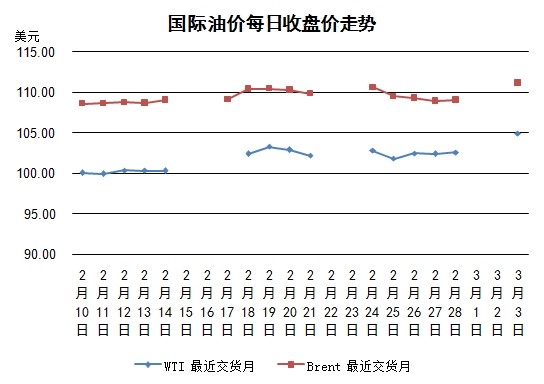 3月3日國際油價(jià)大漲,WTI期貨價(jià)格為5個(gè)半月以來最高,布倫特期貨價(jià)格則為去年12月30日以來最高。俄羅斯可能軍事介入烏克蘭,并引發(fā)俄羅斯同美國及西歐國家的對(duì)立。俄羅斯是油氣出口國,因此市場(chǎng)擔(dān)心烏克蘭局勢(shì)升級(jí)將影響原油供給關(guān)系。外匯市場(chǎng)美元對(duì)歐元走高,不利于油價(jià)上漲,但是原油當(dāng)日依然保持堅(jiān)挺。烏克蘭稱俄羅斯正在離克里米亞最近的狹窄水域附近集結(jié)武裝車輛。周末俄羅斯總統(tǒng)普京稱為了保護(hù)俄羅斯利益和公民他有權(quán)對(duì)烏克蘭動(dòng)武。