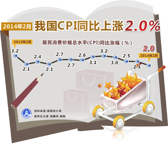 國家統(tǒng)計局9日發(fā)布的數(shù)據(jù)顯示,2月份全國居民消費價格總水平(CPI)同比上漲2.0%,比1月份同比漲幅回落0.5個百分點,創(chuàng)去年2月以來的新低。
