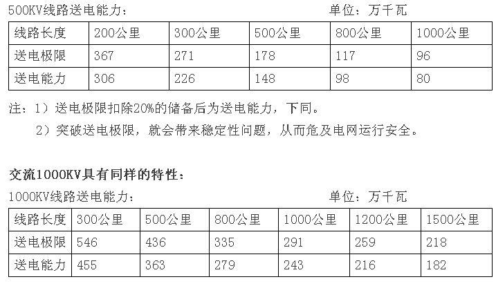 根據(jù)電工原理,交流輸電的功率特性為正弦曲線。在輸電電壓等級確定以后,交流輸電線路的送電能力與線路的長度成反比,即送電距離增加,送電能力下降。以500KV~1000KV單回線為例: