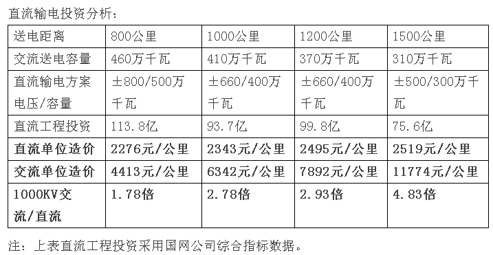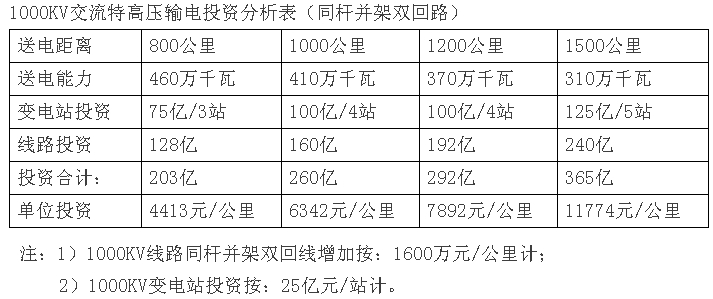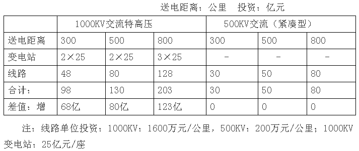 從上表可以清楚看出,1000KV線路送電800公里,送電能力為460萬千瓦,工程投資203億元,折合每公里輸電單位造價4413元/公里;當(dāng)送電距離增加到1500公里時,送電能力下降到310萬千瓦,而輸電投資增加到365億元,折合到每公里輸電單位造價11774元/公里,增加了2.67倍。