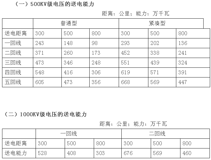 當(dāng)1000KV交流特高壓采用兩回線送電時,300-800公里的送電能力為460-680萬千瓦,平均每回線的送電能力為230-340萬千瓦。