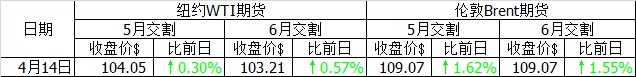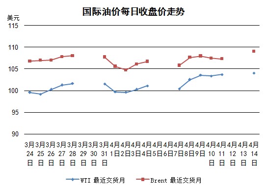 當(dāng)日受烏克蘭局勢(shì)升溫以及美國(guó)經(jīng)濟(jì)指標(biāo)利好影響,國(guó)際油價(jià)上漲。烏克蘭東部局勢(shì)周末升溫,烏克蘭治安部隊(duì)和親俄勢(shì)力的對(duì)立發(fā)生激化。以美國(guó)為首的西方國(guó)家繼續(xù)加強(qiáng)對(duì)俄羅斯制裁。這一形勢(shì)導(dǎo)致市場(chǎng)擔(dān)憂增加。另外,美國(guó)商務(wù)部早上公布的3月零售額銷(xiāo)售額比上月增加1.1%,超出路透社調(diào)查預(yù)計(jì)的0.8%的增幅。然而,利比亞西部石油出口港以及附近的煉油廠已經(jīng)重新開(kāi)始運(yùn)營(yíng),這一消息利空油價(jià),限制了油價(jià)的漲幅。