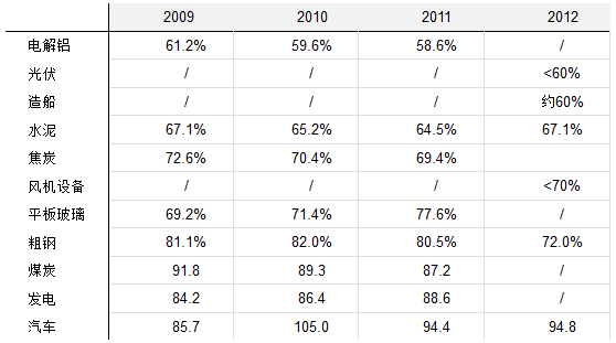 表2、中國部分行業(yè)的產(chǎn)能利用率(2009-2012)