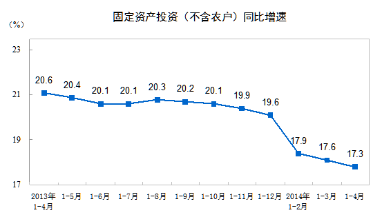 2014年1-4月份,全國固定資產(chǎn)投資(不含農(nóng)戶)107078億元,同比名義增長17.3%,增速比1-3月份回落0.3個(gè)百分點(diǎn)。從環(huán)比速度看,41.17%。