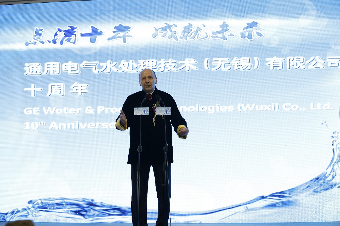 圖為通用電氣水處理集團副總裁、全球供應鏈總經(jīng)理IstvanZsirai在10周年慶典上致辭