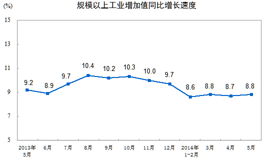 2014年5月份,規(guī)模以上工業(yè)增加值同比實際增長8.8%(以下增加值增速均為扣除價格因素的實際增長率),比4月份加快0.1個百分點。從環(huán)比看,5月份比上月增長0.71%。1-5月份,規(guī)模以上工業(yè)增加值同比增長8.7%。
