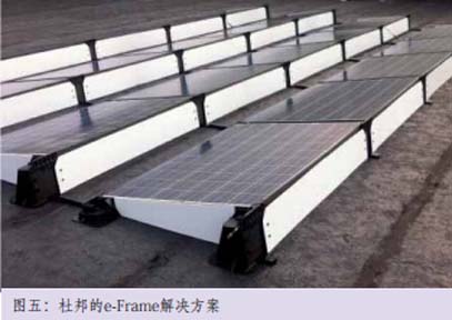 李光華在幾個月前參加完2014年日本光伏展后感觸頗深,“我們一直在尋找未來的支架材料,這次在日本看到了水泥支架、木支架、PVC塑料等多種新型支架。”事實(shí)上,著名材料供應(yīng)商杜邦已經(jīng)在2013年開始推廣其基于高分子復(fù)合材料的e-Frame一體化邊框支架解決方案。杜邦的秦懷禮博士表示e-Frame方案擁有輕量化和快速安裝的特點(diǎn),目前已經(jīng)在上海、南通、岳陽等多個分布式項(xiàng)目中使用。e-Frame一體化邊框系統(tǒng)包括成套的邊框和支架,設(shè)計(jì)成插件式結(jié)構(gòu)后將加快組件安裝時間。秦懷禮告訴記者,“采用這套系統(tǒng)后平屋頂項(xiàng)目可以比常規(guī)方式節(jié)省60%的安裝時間,斜屋頂項(xiàng)目則能節(jié)約30%的安裝時間。綜合算下來成本要低于傳統(tǒng)鋁合金的邊框和支架組合。”傳統(tǒng)支架往往需要在屋頂上安裝一套固定系統(tǒng),eFrame則相對簡單許多,“平面屋頂主要靠自重式結(jié)構(gòu)進(jìn)行抗風(fēng),組件陣列會加裝擋風(fēng)板。如果在風(fēng)速特別大的地方,支架上還有配重裝置,通過磚塊、石塊等物體做壓塊進(jìn)行配重。每塊組件加8公斤的配重就可以抵抗超過級別高的大風(fēng)。”一個項(xiàng)目業(yè)主對比鋁材支架和e-Frame支架在對抗同級別大風(fēng)的情況發(fā)現(xiàn),e-Frame的壓塊為8公斤,而鋁材支架的配重壓塊需要近70公斤。對于斜面屋頂?shù)姆植际巾?xiàng)目,eFrame只需要通過膨脹螺絲來進(jìn)行固定,而不用安裝鋁材支架通常所需要的導(dǎo)軌。
