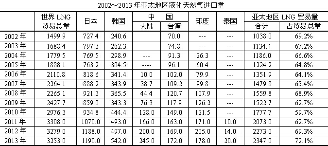 亞洲是世界上最大的LNG(液化天然氣)市場,一直占有世界LNG貿(mào)易量的最大份額,2013年亞洲占有LNG貿(mào)易總量的72.1%,又創(chuàng)新高。2011年3月福島核電站泄漏事故發(fā)生后,日本公共事業(yè)公司大量進口LNG等化石燃料,推動了LNG消費。盡管日本試圖重啟核能發(fā)電,有可能減少LNG供應(yīng),但由于亞洲國家的經(jīng)濟發(fā)展對能源的需求,另外中國大陸和韓國對LNG的需求,仍然刺激亞洲LNG的增加。LNG貿(mào)易仍然是世界上發(fā)展得最快的貿(mào)易形式。