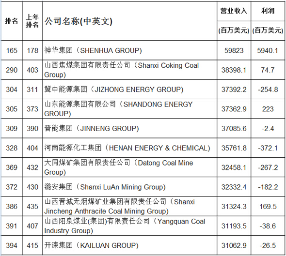 從煤炭上榜企業(yè)看,與去年相同,今年仍為11家煤企上榜,位次較上年均有所上升。其中,神華以第598.23億美元的營(yíng)業(yè)收入,高居排行榜第165位,比上年的178位上升13位。山西焦煤集團(tuán)有限責(zé)任公司由去年的第403位,上升至290位,成為排名上升速度最快的煤企。