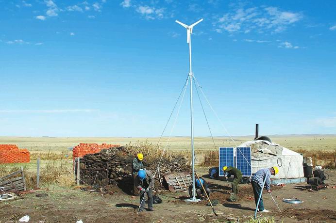 因為總面積約10萬平方千米的呼倫貝爾草原,是世界著名的三大草原之一,是中國現(xiàn)存最豐美的優(yōu)良牧場。破壞草原,愧對子孫。最后確定項目內(nèi)容為:用單戶式風(fēng)光儲發(fā)電設(shè)備為草原牧民通電。因為如果用常規(guī)電網(wǎng)為草原深處的牧民供電,需要架設(shè)很長的輸電線路,其經(jīng)濟性很差,很不現(xiàn)實,對草原的破壞性也很大。而草原深處風(fēng)能和太陽能蘊藏量十分豐富。采用風(fēng)能、太陽能這些可再生清潔能源發(fā)電,則可基本滿足牧民們的生活及照明用電。利用單戶式風(fēng)光互補發(fā)電設(shè)備既可以有效解決牧民的用電問題,又能保證草原絲毫不被破壞。因為這種設(shè)備占地面積很小,在牧民家的院子里甚至窗臺下、蒙古包旁就能安裝。