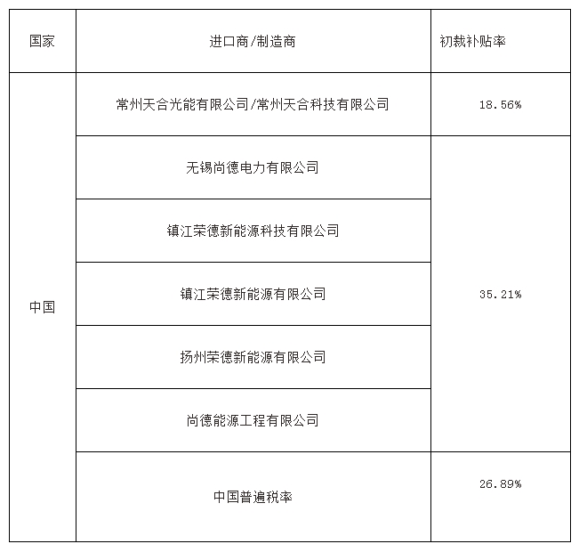 6月2日,美國商務部公布了針對中國大陸的反補貼初裁結果,初步認定的補貼稅率如下: