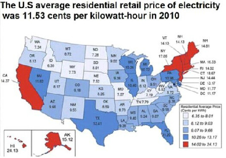 美國各地電費不同,有的地方便宜,一度電(kilo watt hour,簡寫kWh)6美分多。少數地方較貴。最貴的是夏威夷,一度電24美分多。全美國的平均電費是11.53美分。平均每家每月用電接近1千度。