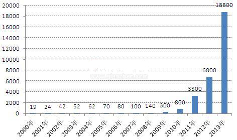 圖表1:2000-2013年中國光伏累計(jì)裝機(jī)容量(單位:MW)