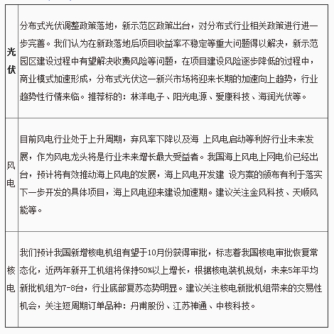 關注標的:隆基股份(分布式市場啟動,單晶技術具備高轉換效率優(yōu)勢,有望獲得推廣)、彩虹精化(轉型分布式光伏運營領域,主要優(yōu)勢在華南地區(qū))、中天科技(從事江蘇省分布式建設)、華光股份(與股東無錫國聯(lián)攜手建設分布式光伏)、森源電氣(河南省分布式光伏龍頭企業(yè))等。