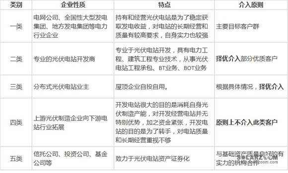 文件認(rèn)為光伏電站行業(yè)定為招行適度進(jìn)入類行業(yè)。綜合考慮上網(wǎng)條件、工程造價(jià)、股東實(shí)力等因素的基礎(chǔ)上,重點(diǎn)支持主流電力企業(yè)投資,位于太陽(yáng)能資源豐富地區(qū)的并網(wǎng)型晶硅光伏發(fā)電項(xiàng)目,擇優(yōu)支持分布式電站,暫不介入薄膜光伏電站、離網(wǎng)光伏電站、光伏制造企業(yè)投資的光伏電站文件對(duì)光伏電站行業(yè)的參與者進(jìn)行了細(xì)致的劃分,并制定嚴(yán)格的光伏電站行業(yè)客戶準(zhǔn)入底線。