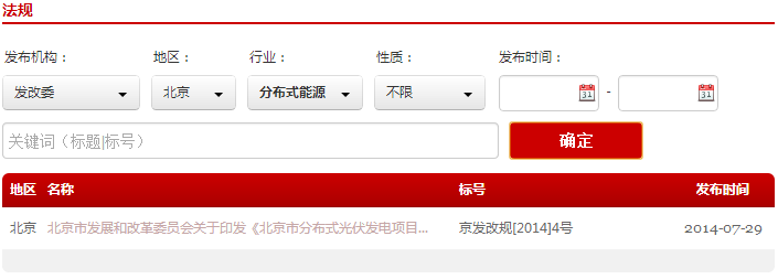1. 分類查詢:可按照發(fā)布機(jī)構(gòu)、地區(qū)、行業(yè)、性質(zhì)和發(fā)布時間進(jìn)行分類查找和篩選,可以單一條件也可以復(fù)合條件分類,比如可以選擇“發(fā)改委”“北京”“分布式能源”三個選項,就可以直接查詢到“北京市發(fā)展和改革委員會關(guān)于印發(fā)《北京市分布式光伏發(fā)電項目管理暫行辦法》的通知”該條法規(guī)政策。