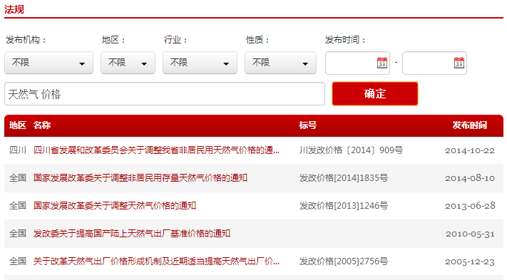 2. 快速搜索:可在搜索欄直接輸入關(guān)鍵詞、標(biāo)題或標(biāo)號等進(jìn)行搜索,便于快速查詢到目標(biāo)內(nèi)容。比如輸入“天然氣 價格”兩個關(guān)鍵詞,就可以得到“國家發(fā)展改革委關(guān)于調(diào)整天然氣價格的通知”等一系列相關(guān)結(jié)果。