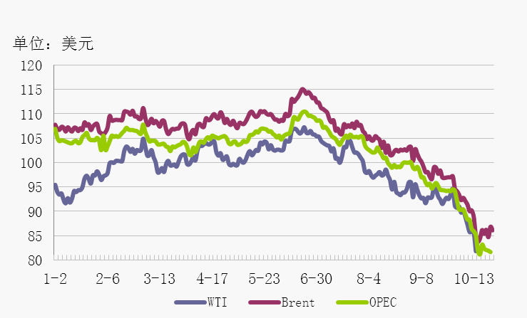 從2014年6月下旬至今,國際油價大幅下跌,11月5日,美國紐約商品交易所、布倫特原油期貨和歐佩克一攬子原油分別報收77.19、82.95、78.11美元/桶,均較6月最高點跌幅近1/4。