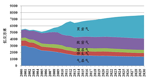 頁巖氣:近年來,由于頁巖氣勘探開發(fā)相關(guān)技術(shù)的突破,美國頁巖氣產(chǎn)量快速增長。根據(jù)美國能源信息署(EIA)的統(tǒng)計,2000-2012年,美國頁巖氣年產(chǎn)量由117.96億立方米上升至2762.95億立方米;2000-2014年,頁巖氣產(chǎn)量占天然氣總量從1.7%迅速接近40%。與此同時,常規(guī)天然氣占天然氣總產(chǎn)量的比重不斷下降,來自常規(guī)氣田的天然氣產(chǎn)量占天然氣總產(chǎn)量的比重由2000年的73.3%下降至2012年的43.1%。EIA預(yù)測美國頁巖氣產(chǎn)量見下圖。