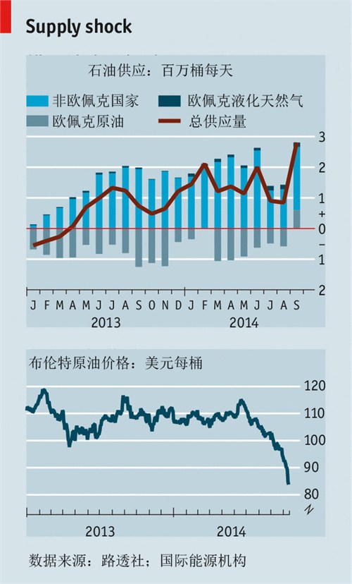國際油價下跌的同時,全球石油日供應(yīng)量卻增長了近91萬桶,OPEC國家與非OPEC國家都在增產(chǎn)。與2013年同期相比,2014年全球石油供應(yīng)總增長280萬桶每日。受利比亞原油恢復(fù)生產(chǎn)和伊拉克產(chǎn)量繼續(xù)提升的推動,OPEC國家9月的原油產(chǎn)量飆升到了13個月的新高,較8月的3066萬桶每日,增長了41.5萬桶每日;2014年非歐佩克國家石油日產(chǎn)量增加170萬桶,利比亞將石油產(chǎn)出增加3倍;伊拉克、南蘇丹等國也恢復(fù)原油出口;ISIS大量低價走私石油。