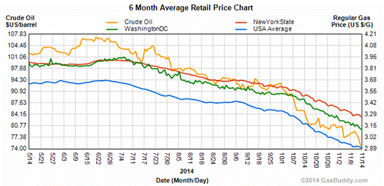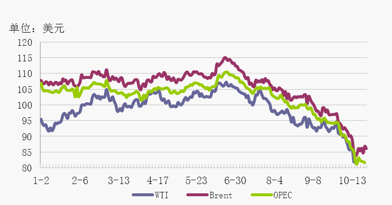 從2014年6月下旬至今,國(guó)際油價(jià)大幅下跌,11月5日,美國(guó)紐約商品交易所原油期貨價(jià)格下跌至77.19美元/桶,布倫特原油期貨價(jià)格為82.95美元/桶,歐佩克一攬子原油報(bào)收為78.11美元/桶,三價(jià)格均較6月最高點(diǎn)跌幅近1/4(見圖1)。