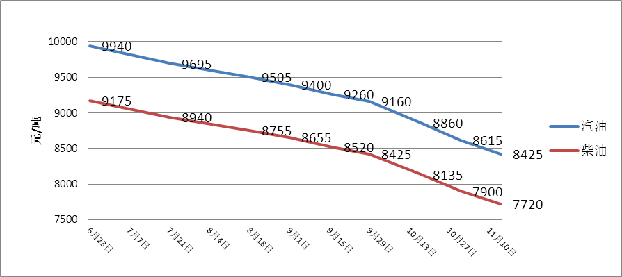國(guó)內(nèi)成品油價(jià)格因國(guó)際油價(jià)也不斷下跌,北京90號(hào)汽油的價(jià)格從6月23日的9940元/噸,連續(xù)八次下跌到11月14日的8425元/噸,下跌了1515元/噸,跌幅達(dá)15.24%(見圖2)。