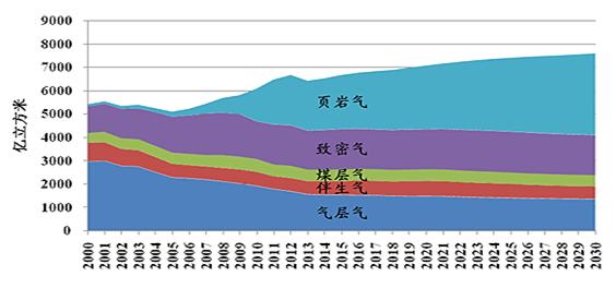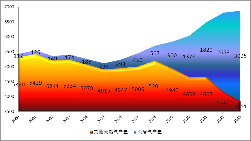 頁(yè)巖氣:近年來(lái),由于頁(yè)巖氣勘探開發(fā)相關(guān)技術(shù)的突破,美國(guó)風(fēng)險(xiǎn)投資和私募股權(quán)投資大舉進(jìn)入頁(yè)巖氣風(fēng)險(xiǎn)勘探市場(chǎng),使美國(guó)的頁(yè)巖氣產(chǎn)量快速增長(zhǎng)。根據(jù)美國(guó)能源信息署(EIA)的統(tǒng)計(jì),2000-2013年,美國(guó)頁(yè)巖氣年產(chǎn)量由117.96億立方米上升至3025億(見圖3)。