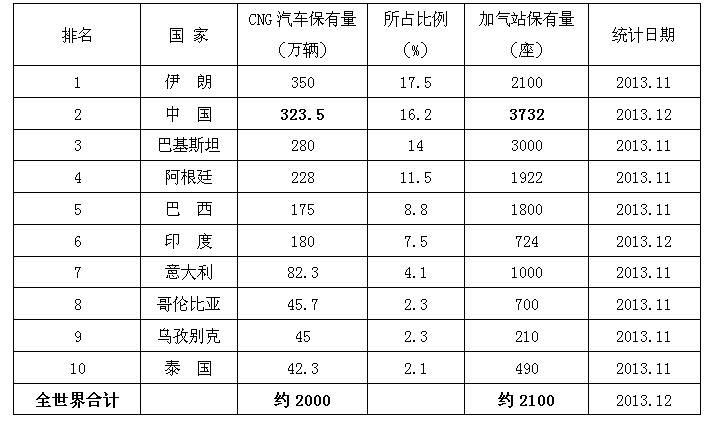 (表1)各國(guó)CNG汽車和加氣站2013年數(shù)據(jù)