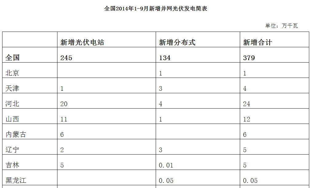 2014年前三季度,全國(guó)新增光伏發(fā)電并網(wǎng)容量379萬(wàn)千瓦,其中,新增光伏電站并網(wǎng)容量245萬(wàn)千瓦,新增分布式光伏并網(wǎng)容量134萬(wàn)千瓦;全國(guó)光伏發(fā)電量約180億千瓦時(shí),相當(dāng)于2013年全年發(fā)電量的200%。