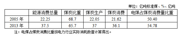 根據(jù)國家統(tǒng)計局和中電聯(lián)發(fā)布的國民經(jīng)濟和能源、電力統(tǒng)計資料,2005年、2013年能源消費總量、煤炭消費占一次能源消費比重、煤炭消費總量、煤炭生產(chǎn)量及電力消費煤炭占煤炭消費量比重指標數(shù)據(jù)見下表: