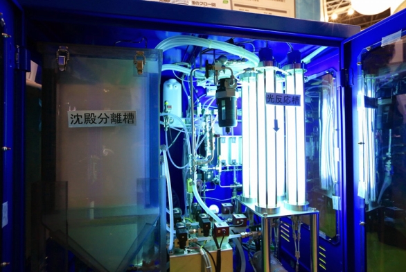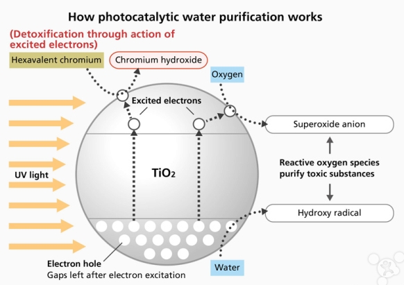 眾所周知,陽光是我們最易得而且完全免費(fèi)的自然資源,而且陽光中的紫外線能夠殺菌。松下這套光催化凈化系統(tǒng)正是利用陽光中的紫外線以及光催化劑來處理水質(zhì)。從下圖展示的工作原理圖來看,這套系統(tǒng)包含兩個(gè)核心部分:分解水中有毒物質(zhì)以及高速凈化水質(zhì)部分。它的催化流程大概是這樣的:先將水混入含有TiO2的沸石中,然后暴露在強(qiáng)烈紫外線下,使水中有毒有害物質(zhì)被分解,之后就能以極快的速度將大流量的水凈化。