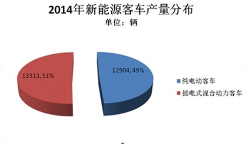 2014年,中國新能源客車產量為26217輛,比上一年增長1.42倍,2014年的產量超過了此前幾年生產的新能源客車總和。其中純電動客車12904輛,比上一年增長6.54倍,插電式混合動力客車13313輛,比上一年增長8.93倍,傳統混合動力客車1193輛,比上一年減少86%。由于傳統混合動力汽車被排除在新能源汽車之外,混合動力客車產量也大幅萎縮,2014年的新能源客車的統計數據也沒有包括傳統混合動力客車。