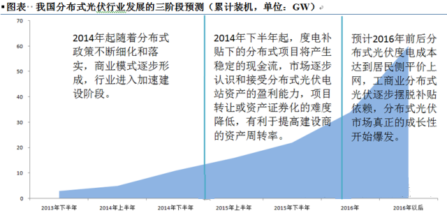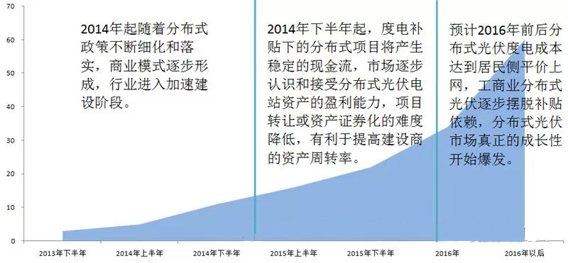 我們認(rèn)為,光伏電站目前無法獲得廣泛、暢通的融資渠道的根本原因在于資產(chǎn)并未得到資本市場的廣泛認(rèn)可,這一過程需要經(jīng)過一段時(shí)間資產(chǎn)現(xiàn)金流的檢驗(yàn)方可完成。我國光伏電站大規(guī)模建設(shè)元年為2013年,度電補(bǔ)貼政策下的分布式光伏2014年下半年啟動(dòng)。我們認(rèn)為在電站運(yùn)營數(shù)據(jù)逐步積累以及政策方面的積極推動(dòng)下,分布式光伏在2015-2016年后將進(jìn)入第二階段(融資口放開階段)。