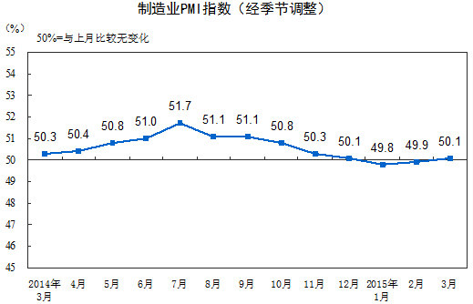 2015年3月,隨著春節(jié)后企業(yè)開工增加,以及國家穩(wěn)增長政策對市場預(yù)期的改善,中國制造業(yè)采購經(jīng)理指數(shù)(PMI)為50.1%,比上月小幅回升0.2個百分點,重回臨界點上方。