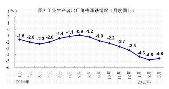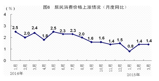 一季度,居民消費價格同比上漲1.2%。其中,城市上漲1.2%,農(nóng)村上漲1.0%。分類別看,食品價格同比上漲1.9%,煙酒及用品下降0.5%,衣著上漲2.9%,家庭設(shè)備用品及維修服務(wù)上漲1.2%,醫(yī)療保健和個人用品上漲1.7%,交通和通信下降1.8%,娛樂教育文化用品及服務(wù)上漲1.2%,居住上漲0.7%。在食品價格中,糧食價格上漲2.8%,油脂價格下降5.1%,豬肉價格下降1.7%,鮮菜價格上漲1.4%。3月份,居民消費價格同比上漲1.4%,環(huán)比下降0.5%。一季度,工業(yè)生產(chǎn)者出廠價格同比下降4.6%,3月份同比下降4.6%,環(huán)比下降0.1%。一季度,工業(yè)生產(chǎn)者購進價格同比下降5.6%,3月份同比下降5.7%,環(huán)比下降0.3%。