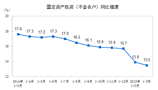 統計局今日公布數據顯示,2015年1-3月份,全國固定資產投資(不含農戶)77511億元,同比名義增長13.5%(扣除價格因素實際增長14.5%),增速比1-2月份回落0.4個百分點。從環(huán)比速度看,3月份固定資產投資(不含農戶)增長1.04%。