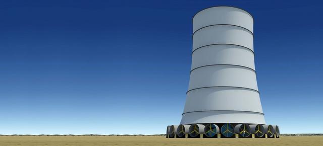 該公司設(shè)計(jì)的“下降氣流塔”(DowndraftTower)非常簡(jiǎn)單,首先在炎熱、干燥的地方建造一個(gè)矩形空心圓柱塔,高度超過(guò)2200英尺,直徑超過(guò)1200英尺。(大約比全球最高的迪拜哈利法塔低了500英尺。)然后將水抽到頂部,向里噴入霧氣。這些霧氣會(huì)冷卻上升的熱氣流,加大重量后使之在塔內(nèi)向下流動(dòng),從而創(chuàng)造出時(shí)速50英里的人造風(fēng),推動(dòng)安裝在塔底的渦輪轉(zhuǎn)動(dòng)。