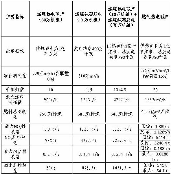 依據(jù)國標(biāo)GB13223-2011《火電廠大氣污染物排放標(biāo)準(zhǔn)》中關(guān)于重點(diǎn)地區(qū)大氣污染物排放特別限值之規(guī)定,分單獨(dú)考慮供熱需求及綜合考慮供熱、供電需求兩種情況對燃煤熱電聯(lián)產(chǎn)、燃?xì)鉄犭娐?lián)產(chǎn)在同等條件下的大氣污染物排放進(jìn)行了計算,計算周期為一個供熱周期(4×30天),供熱面積1億平方米。