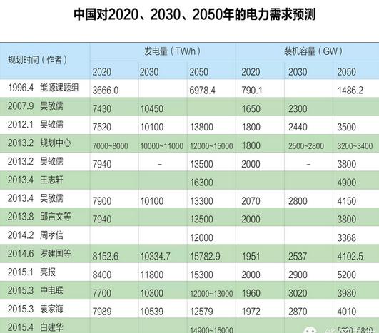 2,中國(guó)在非化石能源發(fā)電,特別是新能源發(fā)電上,發(fā)展速度很快,在世界上處于領(lǐng)先地位,重復(fù)容量多,要增加裝機(jī)容量。水力發(fā)電具有季節(jié)性,風(fēng)電、太陽(yáng)能光伏發(fā)電,具有間歇性、隨機(jī)性、不穩(wěn)定性,都有相當(dāng)多的重復(fù)容量,包括儲(chǔ)能設(shè)備容量,以及為水電、風(fēng)電、太陽(yáng)能光伏發(fā)電調(diào)峰,調(diào)頻,備用等服務(wù)的發(fā)電容量。白建華電力預(yù)測(cè)中,2050年裝機(jī)容量所以這么大與高速發(fā)展非化石能源發(fā)電有關(guān),在他設(shè)定的2050年裝機(jī)容量方案中,非化石能源發(fā)電除核電外都是最高的,水電5.4億千瓦,可以說(shuō)是我國(guó)水利資源可以得到100%開(kāi)發(fā)的水平,風(fēng)電裝機(jī)達(dá)到15—20億千瓦;太陽(yáng)能發(fā)電裝機(jī)達(dá)到15—20億千瓦;生物質(zhì)發(fā)電裝機(jī)0.8—1億千瓦,可再生能源裝機(jī)達(dá)到36.2—46.4億千瓦,2050年我國(guó)可再生能源裝機(jī)將占全國(guó)總裝機(jī)的64%—71%,占全國(guó)用電量的57%—70%。白建華的預(yù)測(cè)可再生能源和新能源發(fā)電都是最高的。此外預(yù)計(jì)核電裝機(jī)規(guī)模達(dá)到2—3億千瓦。