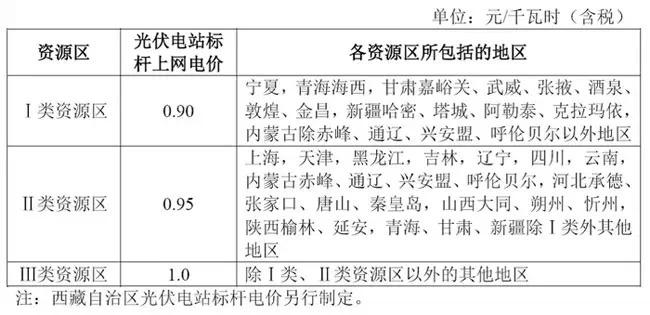 圖1:全國(guó)光伏電站標(biāo)桿上網(wǎng)電價(jià)表
