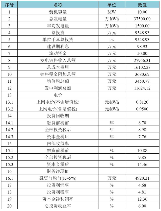測(cè)算條件:?jiǎn)挝磺咴靸r(jià)為9400元,裝機(jī)容量為10MW,年滿發(fā)小時(shí)數(shù)為1500h,電價(jià)為0.95元/kWh