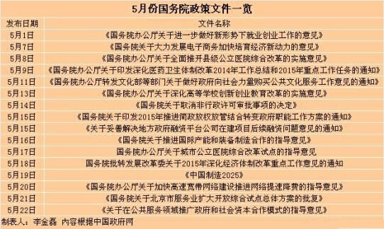 剛剛過(guò)去的5月份,國(guó)務(wù)院先后出臺(tái)了十余份重磅文件。從推進(jìn)簡(jiǎn)政放權(quán)、部署醫(yī)改,到發(fā)布《中國(guó)制造2025》,再到促進(jìn)大眾創(chuàng)業(yè)、萬(wàn)眾創(chuàng)新,督促網(wǎng)絡(luò)“提速降費(fèi)”……一系列動(dòng)作凸顯出“促改革、調(diào)結(jié)構(gòu)、惠民生”這三大關(guān)鍵詞。