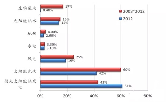 2008年以來(lái),太陽(yáng)能、風(fēng)電等可再生能源領(lǐng)域發(fā)展迅速。2008~2012年,太陽(yáng)能光伏裝機(jī)年均增長(zhǎng)率在60%左右;聚光太陽(yáng)能熱發(fā)電裝機(jī)年均增長(zhǎng)40%左右;風(fēng)電裝機(jī)年均增長(zhǎng)約25%;生物質(zhì)柴油產(chǎn)能年均增長(zhǎng)17%左右;水電發(fā)展相對(duì)穩(wěn)定,年均增長(zhǎng)3~4%。
