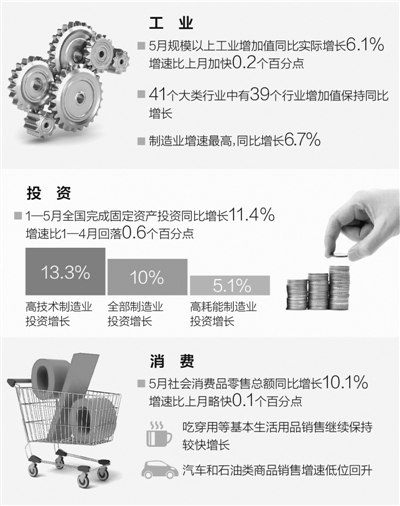 國家統(tǒng)計局11日公布的宏觀數(shù)據(jù)顯示,5月份工業(yè)生產(chǎn)增長繼續(xù)加快,投資增速小幅回升,社會消費品零售總額繼續(xù)保持平穩(wěn)增長,特別是新興業(yè)態(tài)繼續(xù)快速發(fā)展,國民經(jīng)濟(jì)運行仍處于合理區(qū)間。