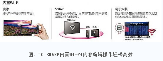 LGSM5KB系列內(nèi)置Wi-Fi,鏡像功能可輕松共享顯示器和其他設(shè)備上的展示內(nèi)容。通過SoftAP功能,顯示器可以對(duì)用戶的設(shè)備作為接入點(diǎn)操作。有了內(nèi)置wifi,省去額外的媒體播放器及以太網(wǎng)/RS232C線纜,優(yōu)化空間的同時(shí)安裝也更為簡便。