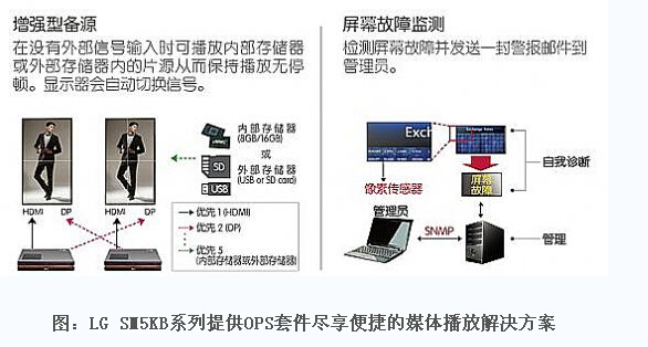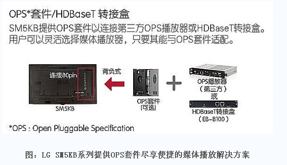 值得注意對(duì)是,智能商顯LGSM5KB系列還提供OPS(OpenPluggableSpecification)開放性可插播規(guī)范功能,只要與OPS套件適配即可靈活選擇媒體播放器,支持各類外部媒體播放器對(duì)接,實(shí)現(xiàn)輕松便捷的媒體播放解決方案。