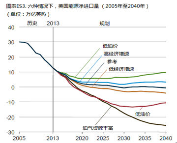在《2015年度能源展望》中,美國(guó)能源進(jìn)口和出口從2028年開(kāi)始達(dá)到平衡。在高油價(jià)及石油和天然氣資源較豐富的情況下,隨著美國(guó)原油和干燥天然氣產(chǎn)量增加及進(jìn)口量的降低,美國(guó)將在2019年成為能源凈出口國(guó)。相反,在低油價(jià)情況下,到2040年,美國(guó)仍然是一個(gè)能源凈進(jìn)口國(guó)(圖ES3)。